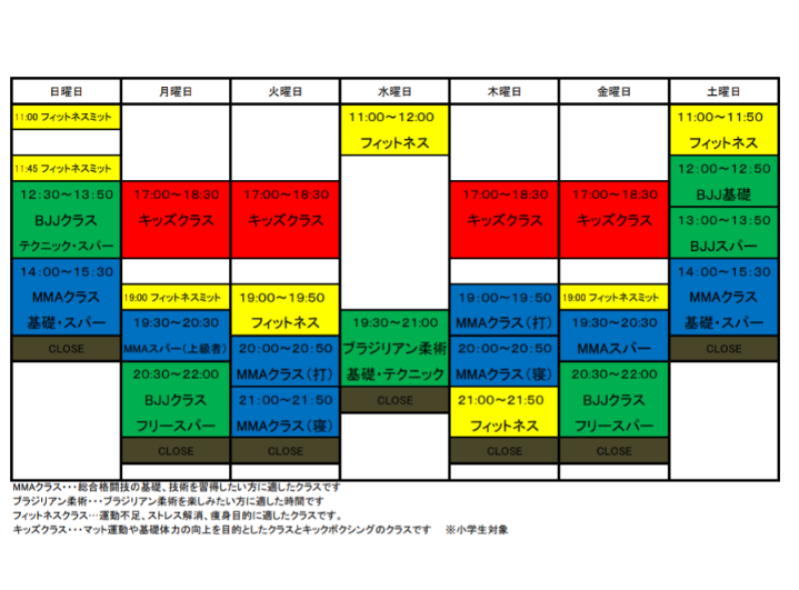 | MMAクラス | 総合格闘技の基礎、技術を習得したい方に適したクラスです。 |
